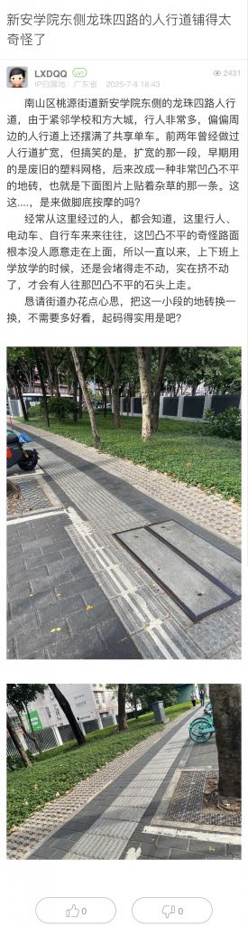 36. 帖文《新安学院东侧龙珠四路的人行道铺得太奇怪了》