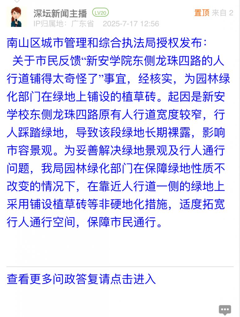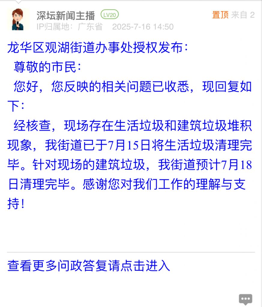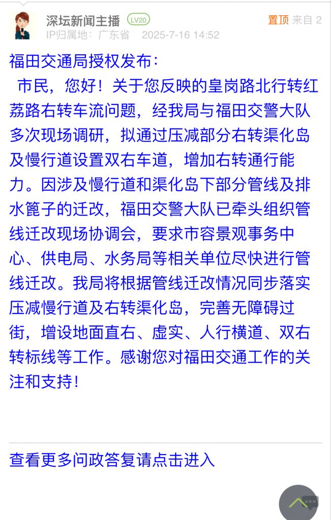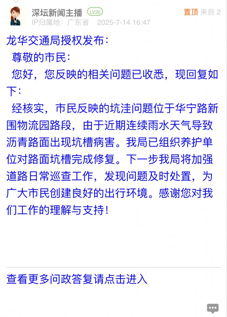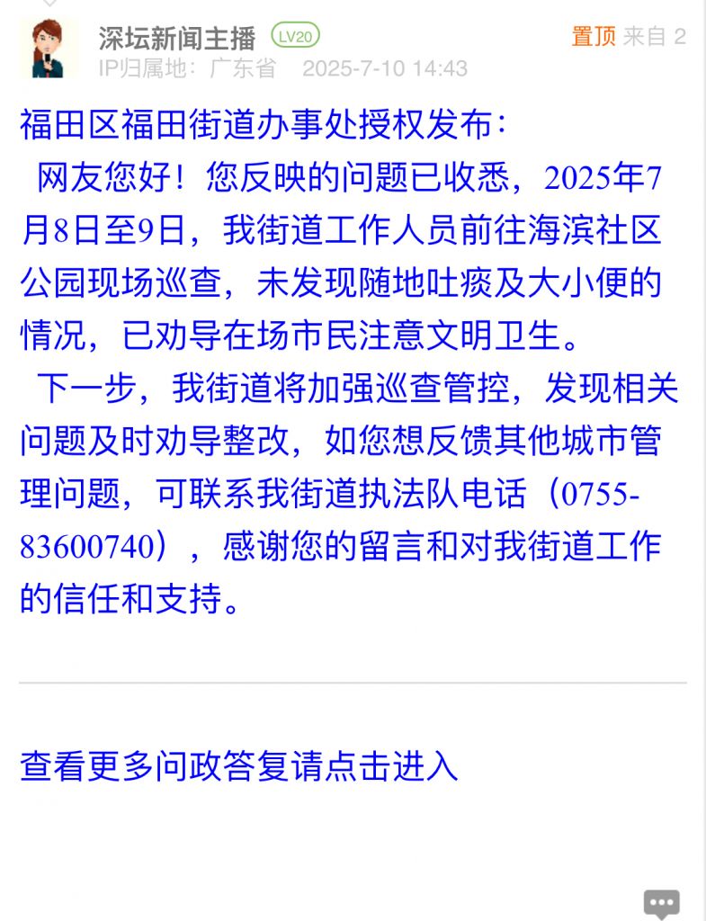 各职能单位如需对网友反映的问题进行回应,可在深圳论坛注册官方账号并通过认证,回帖进行回应。