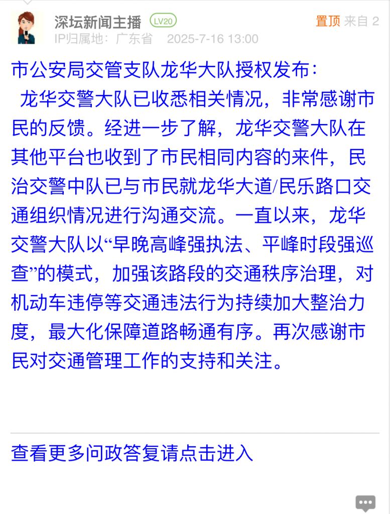 龙华交警大队已收悉相关情况,非常感谢市民的反馈。经进一步了解,龙华交警大队在其他平台也收到了市民相同内容的来件,民治交警中队已与市民就龙华大道/民乐路口交通组织情况进行沟通交流。一直以来,龙华交警大队以“早晚高峰强执法、平峰时段强巡查”的模式,加强该路段的交通秩序治理,对机动车违停等交通违法行为持续加大整治力度,最大化保障道路畅通有序。再次感谢市民对交通管理工作的支持和关注。