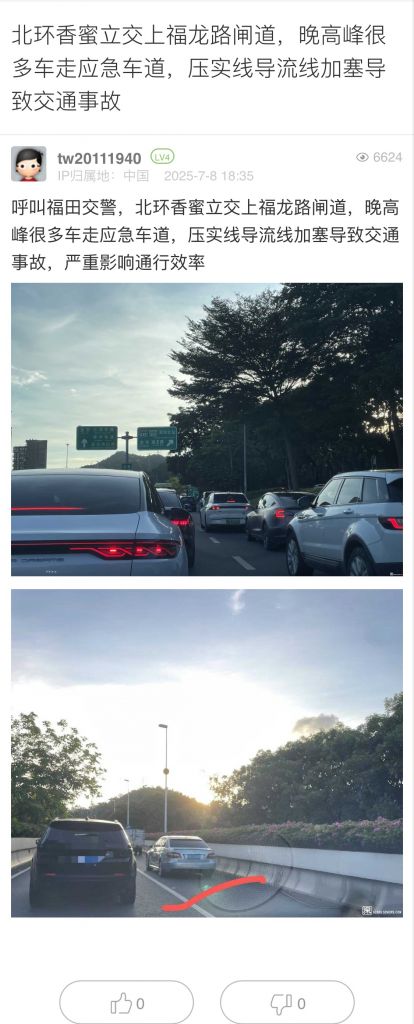 12. 帖文《北环香蜜立交上福龙路闸道,晚高峰很多车走应急车道,压实线导流线加塞导致交通事故》