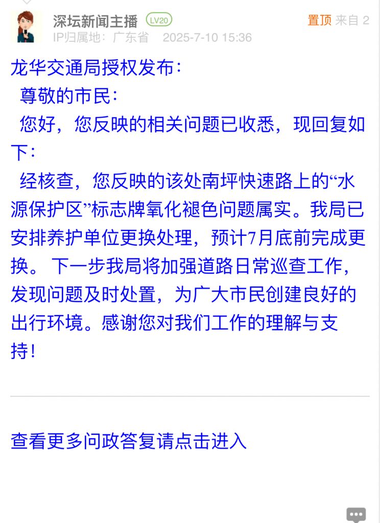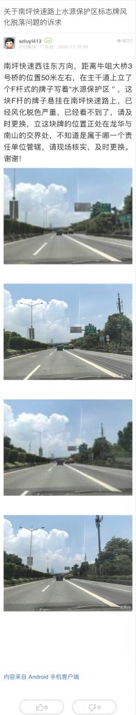 5. 帖文《关于南坪快速路上水源保护区标志牌风化脱落问题的诉求》