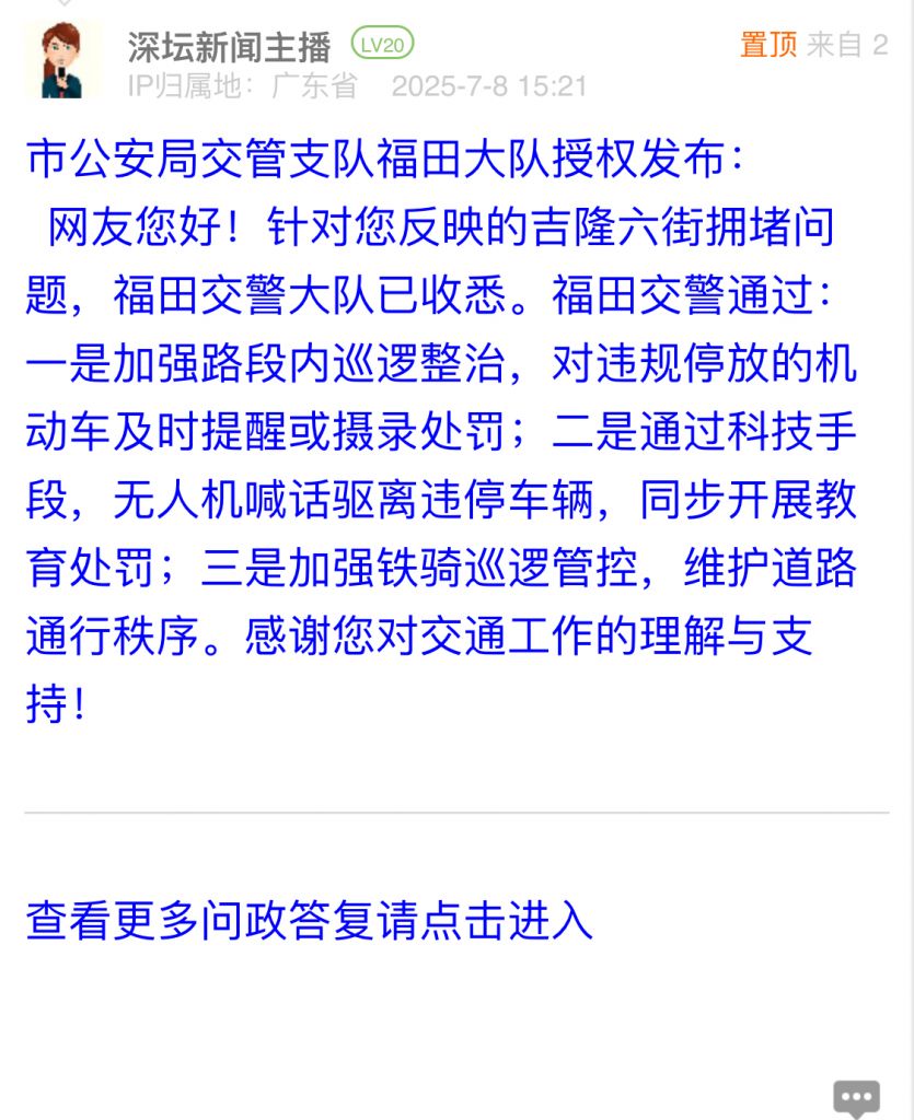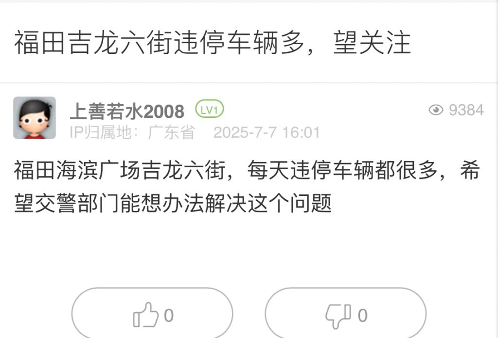 7. 帖文《福田吉龙六街违停车辆多,望关注》