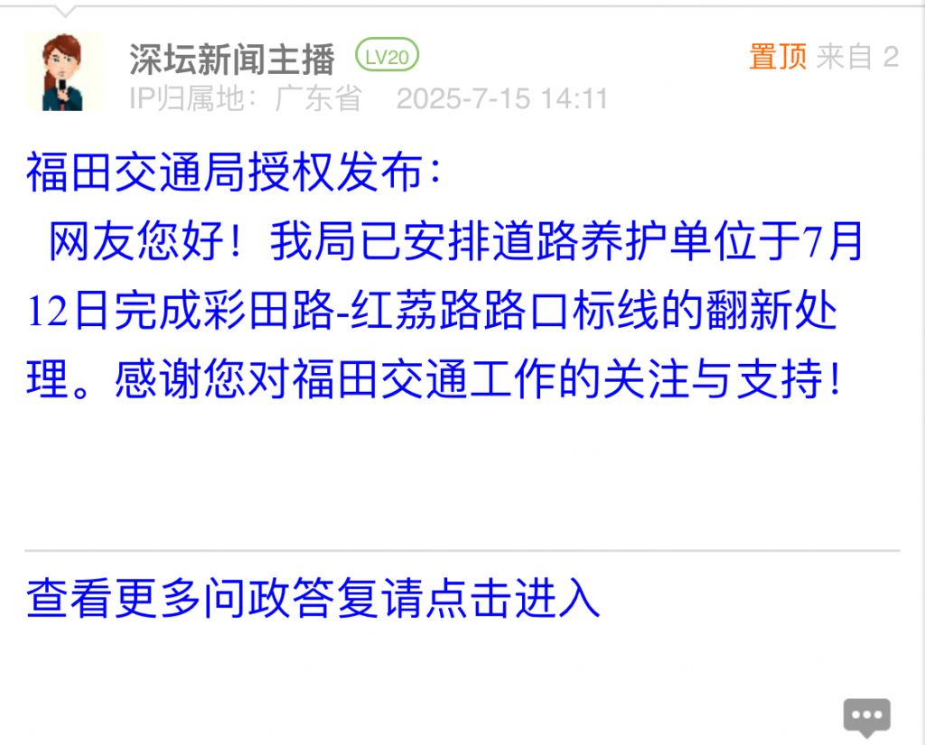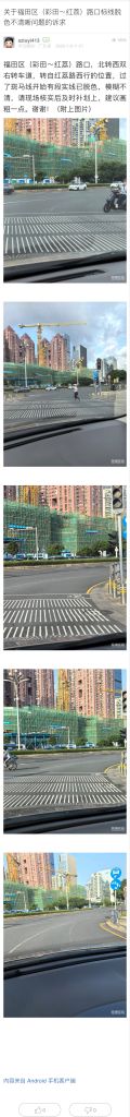 9. 帖文《关于福田区(彩田~红荔)路口标线脱色不清晰问题的诉求》