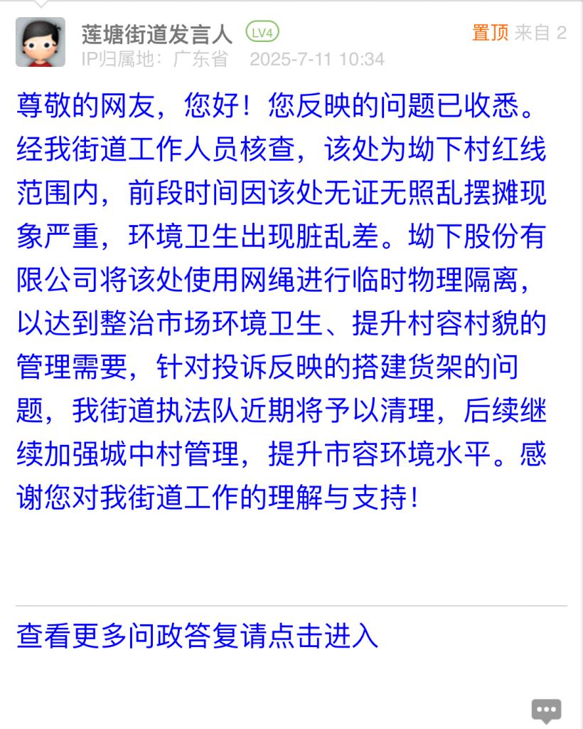 尊敬的网友,您好!您反映的问题已收悉。经我街道工作人员核查,该处为坳下村红线范围内,前段时间因该处无证无照乱摆摊现象严重,环境卫生出现脏乱差。坳下股份有限公司将该处使用网绳进行临时物理隔离,以达到整治市场环境卫生、提升村容村貌的管理需要,针对投诉反映的搭建货架的问题,我街道执法队近期将予以清理,后续继续加强城中村管理,提升市容环境水平。感谢您对我街道工作的理解与支持!
