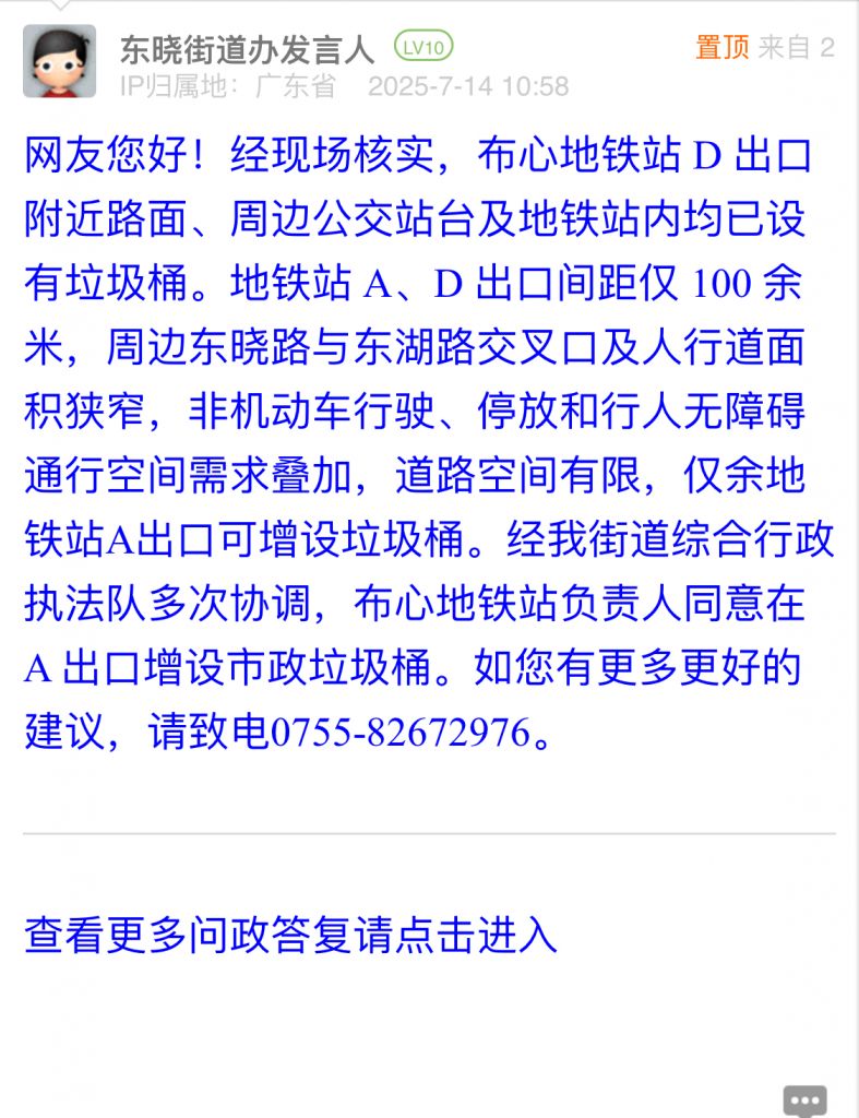 网友您好!经现场核实,布心地铁站 D 出口附近路面、周边公交站台及地铁站内均已设有垃圾桶。地铁站 A、D 出口间距仅 100 余米,周边东晓路与东湖路交叉口及人行道面积狭窄,非机动车行驶、停放和行人无障碍通行空间需求叠加,道路空间有限,仅余地铁站A出口可增设垃圾桶。经我街道综合行政执法队多次协调,布心地铁站负责人同意在 A 出口增设市政垃圾桶。如您有更多更好的建议,请致电0755-82672976。