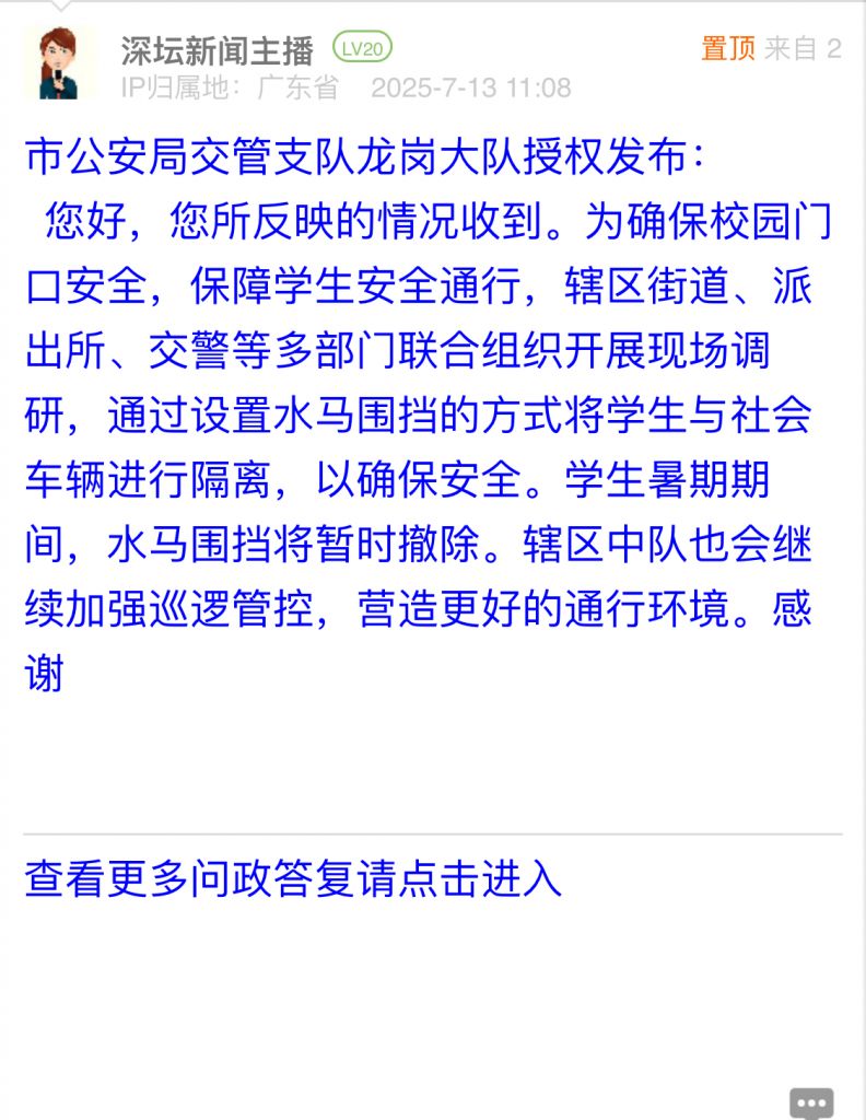 16. 帖文《关于坂田街道办雅宝小学道路存在安全隐患的诉求与建议》