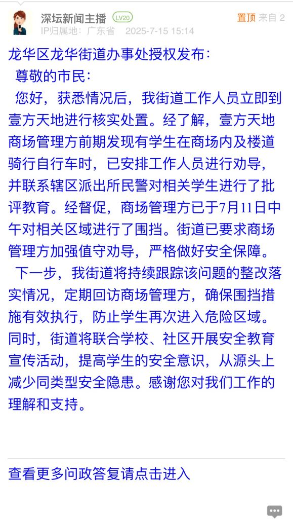 您好,获悉情况后,我街道工作人员立即到壹方天地进行核实处置。经了解,壹方天地商场管理方前期发现有学生在商场内及楼道骑行自行车时,已安排工作人员进行劝导,并联系辖区派出所民警对相关学生进行了批评教育。经督促,商场管理方已于7月11日中午对相关区域进行了围挡。街道已要求商场管理方加强值守劝导,严格做好安全保障。