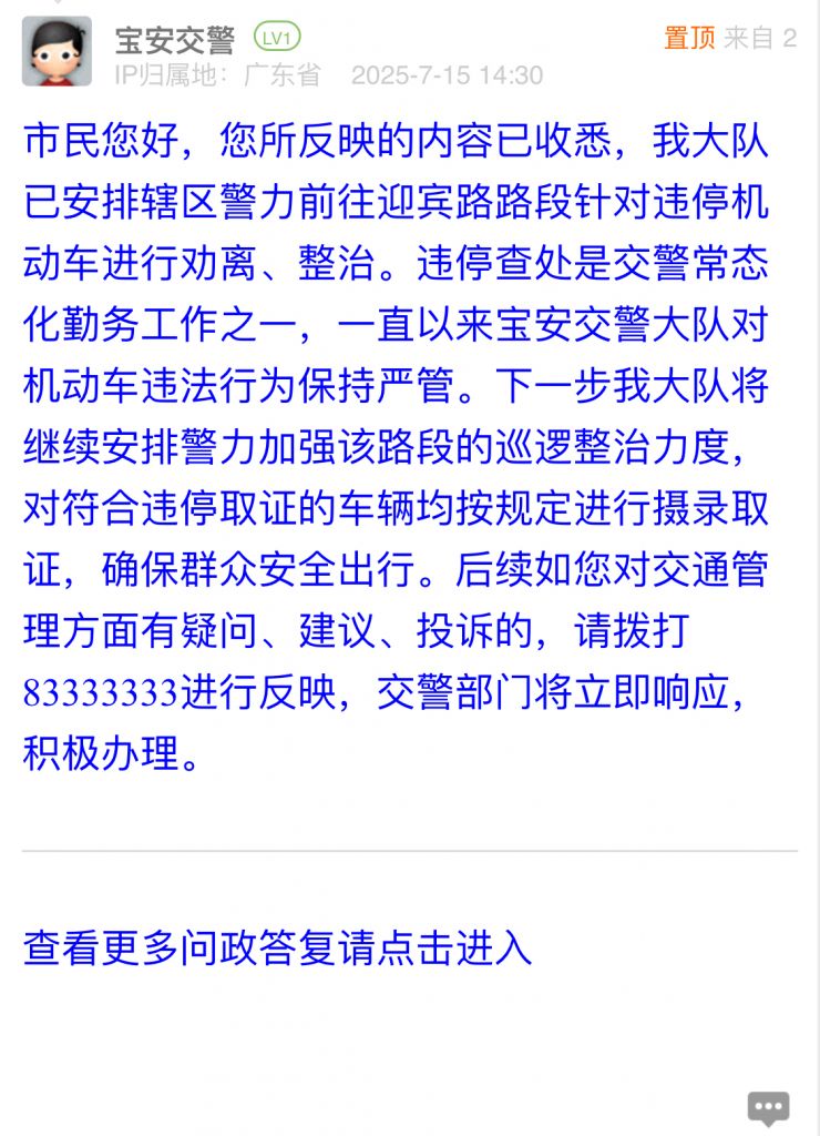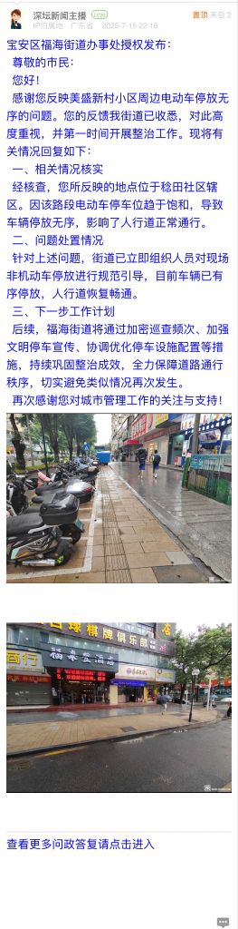 据统计,2025年7月7日-2025年7月13日,网友在深圳论坛发布问政类帖文共37篇,得到相关单位正式回应的帖文数为37篇,本期简报回应速度最快的单位:市公安局交管支队福田大队、宝安区西乡街道办事处、罗湖区莲塘街道办事处、龙华交通局。