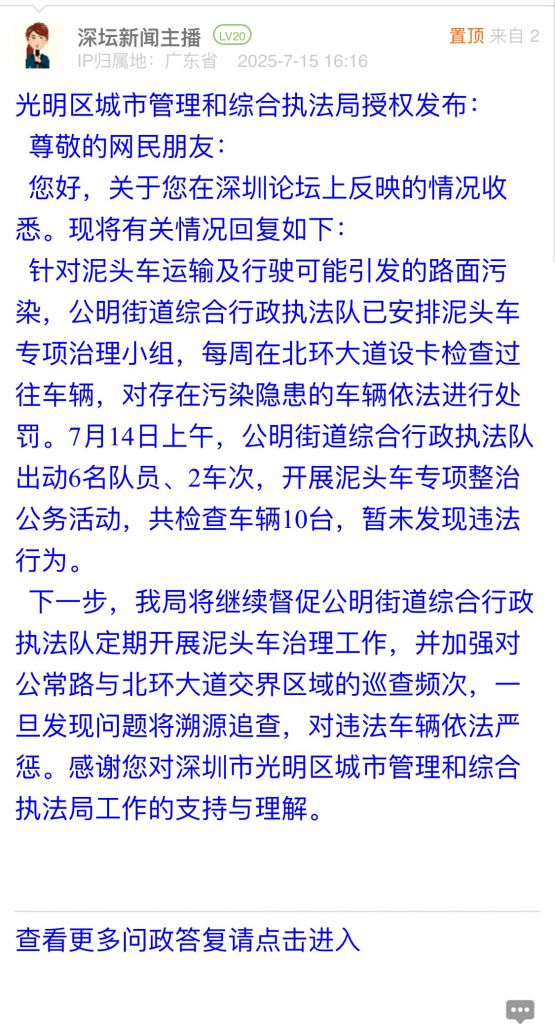 下一步,我局将继续督促公明街道综合行政执法队定期开展泥头车治理工作,并加强对公常路与北环大道交界区域的巡查频次,一旦发现问题将溯源追查,对违法车辆依法严惩。感谢您对深圳市光明区城市管理和综合执法局工作的支持与理解。