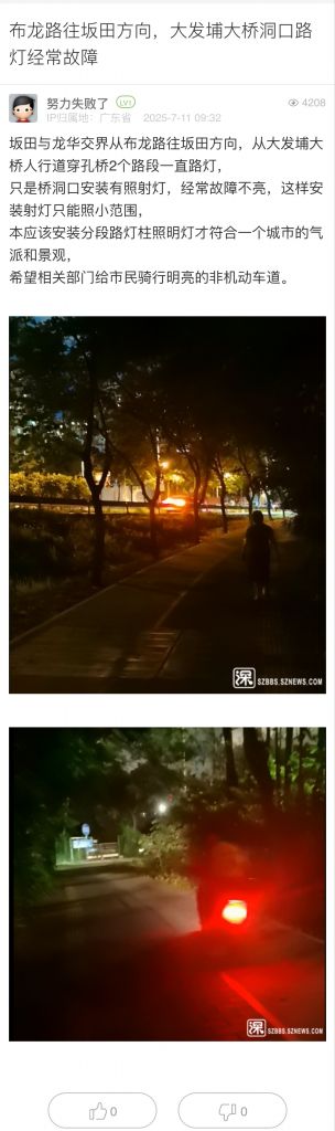 24. 帖文《布龙路往坂田方向,大发埔大桥洞口路灯经常故障》