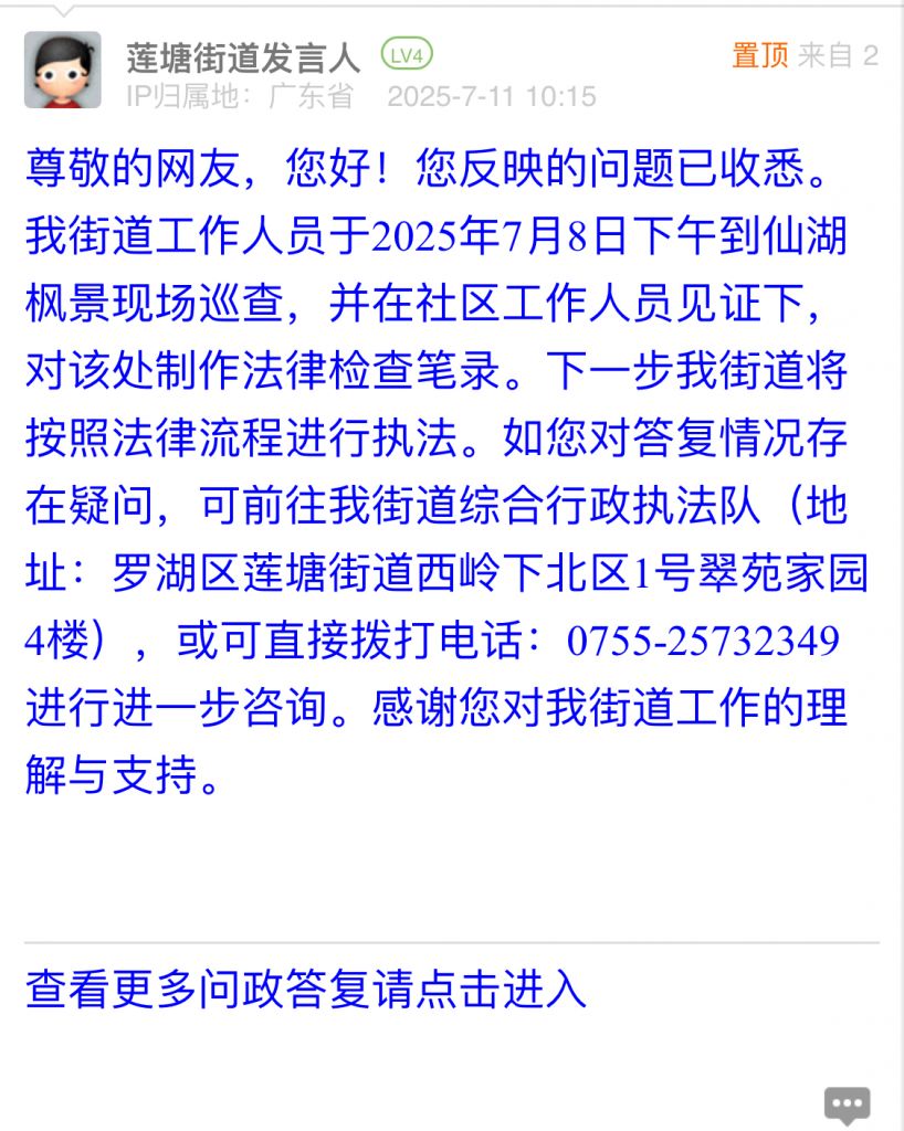 尊敬的网友,您好!您反映的问题已收悉。我街道工作人员于2025年7月8日下午到仙湖枫景现场巡查,并在社区工作人员见证下,对该处制作法律检查笔录。下一步我街道将按照法律流程进行执法。如您对答复情况存在疑问,可前往我街道综合行政执法队(地址:罗湖区莲塘街道西岭下北区1号翠苑家园4楼),或可直接拨打电话:0755-25732349进行进一步咨询。感谢您对我街道工作的理解与支持。