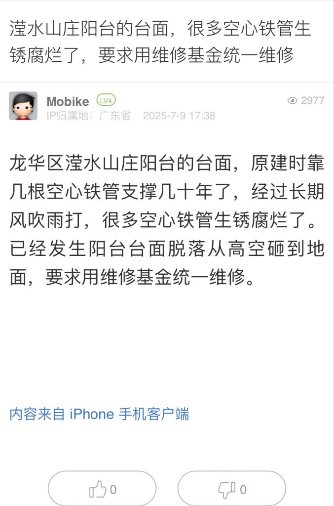 15. 帖文《滢水山庄阳台的台面,很多空心铁管生锈腐烂了,要求用维修基金统一维修》