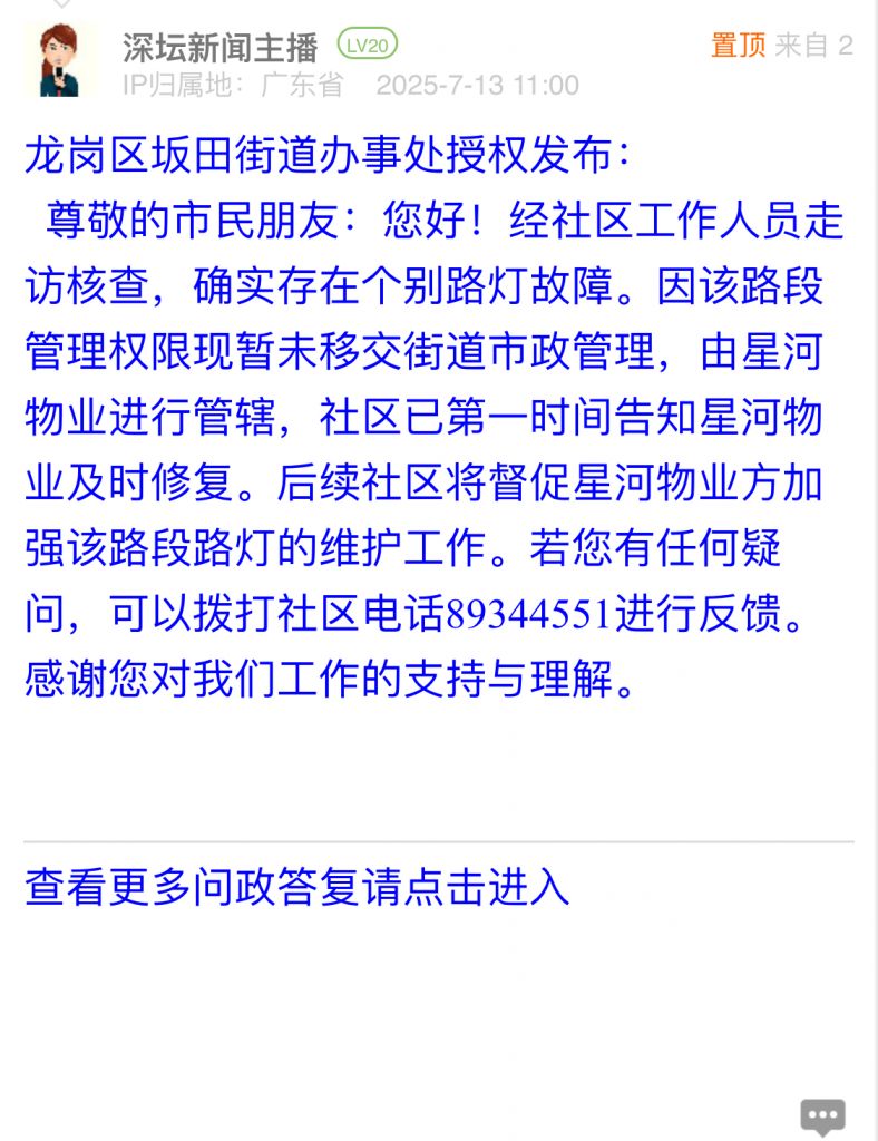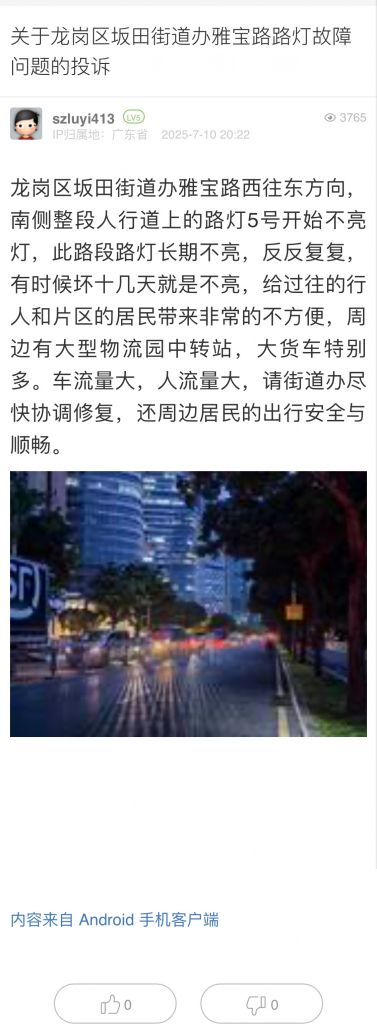 21. 帖文《关于龙岗区坂田街道办雅宝路路灯故障问题的投诉》《路灯不亮问题反复反映多年问题的诉求与建议》