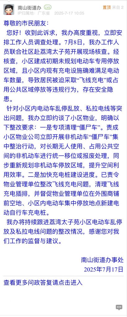 针对小区内电动车乱停乱放、私拉电线等突出问题,我办立即约谈了小区物业,明确以下整改要求:一是专项清理“僵尸车”。责成小区物业公司立即开展非机动车“僵尸车”集中整治行动,对长期无人使用、占用公共空间的非机动车进行统一移位或报废处理,同步重新规划非机动车停放区域,提升空间利用效率。二是加快充电桩建设进度。已责令物业管理单位整改飞线充电问题,清理飞线充电插排,并督促物业管理单位在外围商铺前空地、小区内电动车集中停放地点新建电动自行车充电桩。