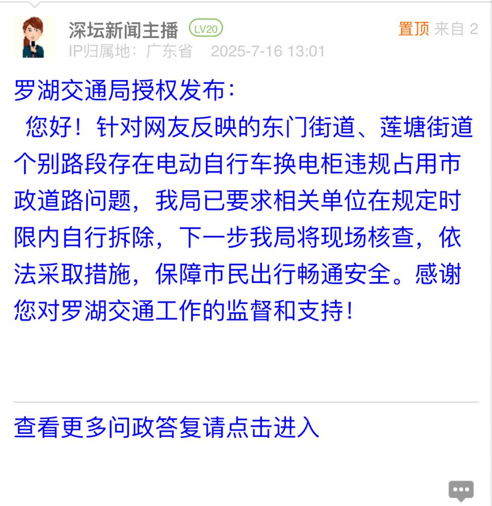 25. 帖文《莲塘的电动自行车换电柜是否违规占用市政道路?》