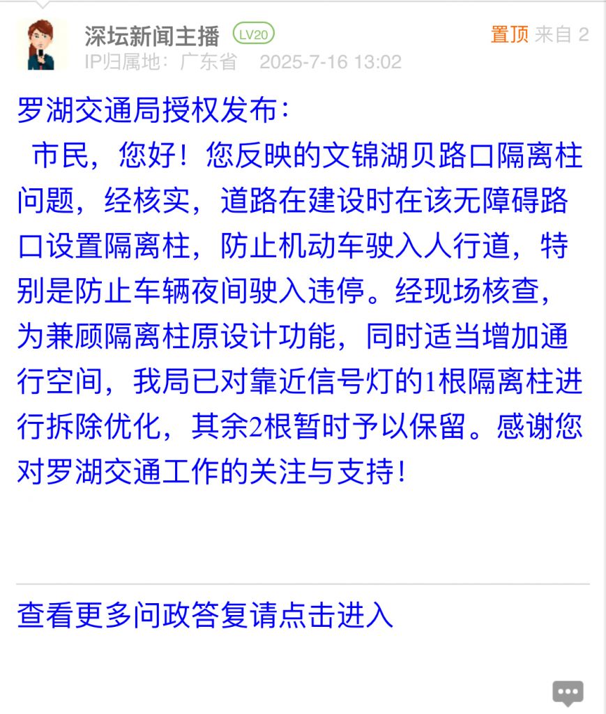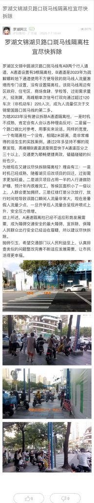 2. 帖文《罗湖文锦湖贝路口斑马线隔离柱宜尽快拆除》