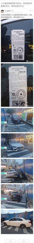27. 帖文《人行道违停是罚款1000元,但这两台车都是200元,请问这是为什么》