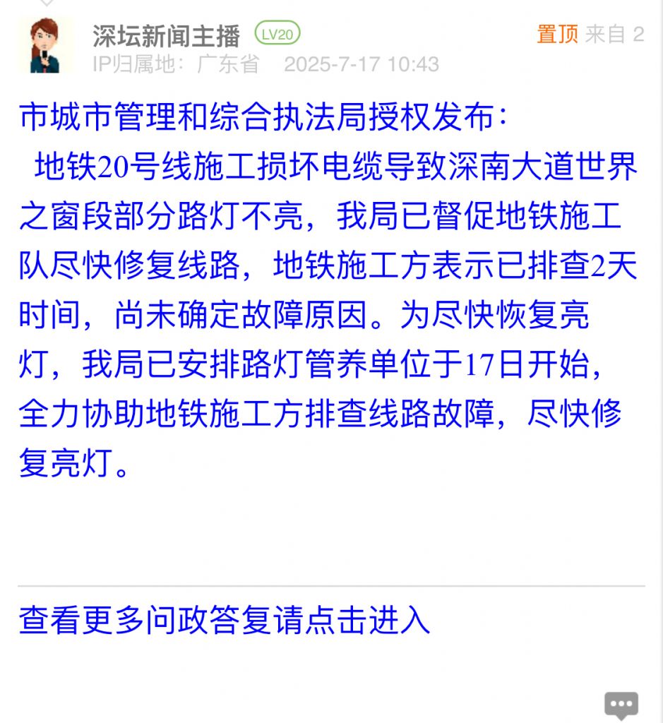地铁20号线施工损坏电缆导致深南大道世界之窗段部分路灯不亮,我局已督促地铁施工队尽快修复线路,地铁施工方表示已排查2天时间,尚未确定故障原因。为尽快恢复亮灯,我局已安排路灯管养单位于17日开始,全力协助地铁施工方排查线路故障,尽快修复亮灯。