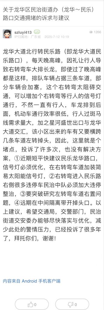 26. 帖文《关于龙华区民治街道办(龙华~民乐)路口交通拥堵的诉求与建议》
