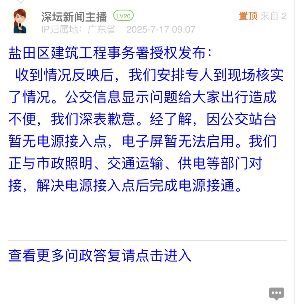 32. 帖文《盐田公交站电子显示屏坏了,看不到公交信息》