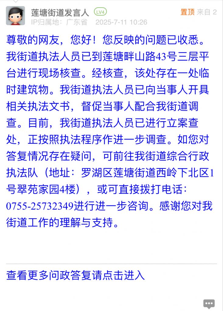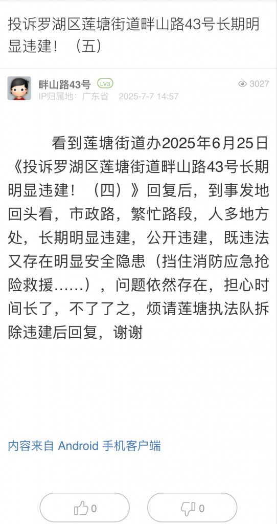 4. 帖文《投诉罗湖区莲塘街道畔山路43号长期明显违建!(五)》