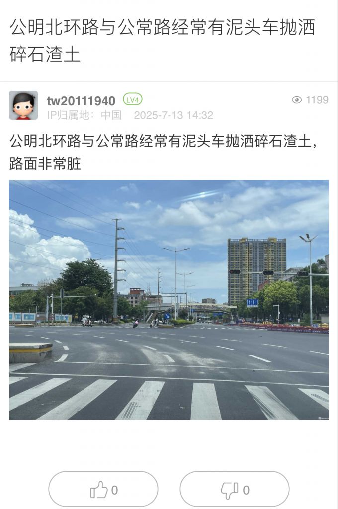 29. 帖文《公明北环路与公常路经常有泥头车抛洒碎石渣土》