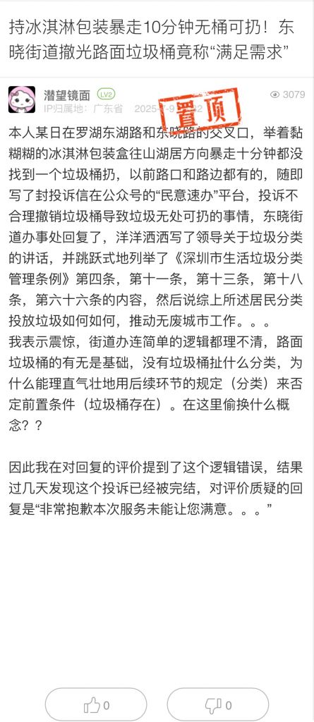 14. 帖文《持冰淇淋包装暴走10分钟无桶可扔!东晓街道撤光路面垃圾桶竟称“满足需求”》