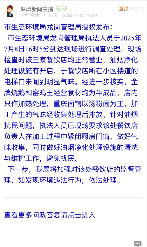 市生态环境局龙岗管理局执法人员于2025年7月8日16时5分到达现场进行调查处理,现场检查时该三家餐饮店均正常营业,油烟净化处理设施有开启,于餐饮店所在小区楼道的电梯口未闻到明显气味。经进一步核实,金牌烧鹅和窑鸡王经营食材均为半成品,店内只作加热处理,重庆面馆以汤粉面为主,加工产生的气味经收集处理后排放。针对油烟扰民问题,执法人员已现场要求该处餐饮店负责人在加工过程中紧闭厨房门窗,做好气味收集,同时做好油烟净化处理设施的清洗与维护工作,避免扰民。