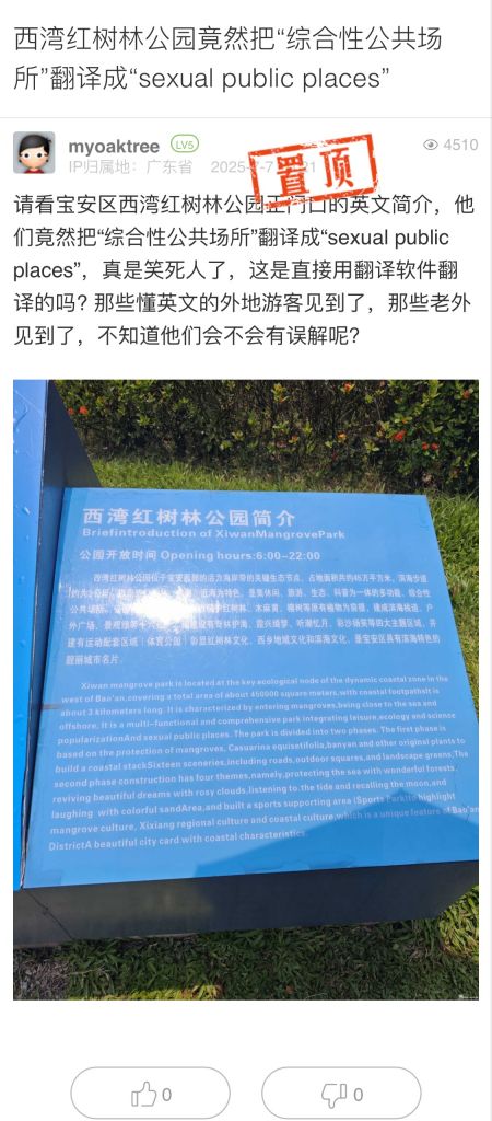 1. 帖文《西湾红树林公园竟然把“综合性公共场所”翻译成“sexual public places”》