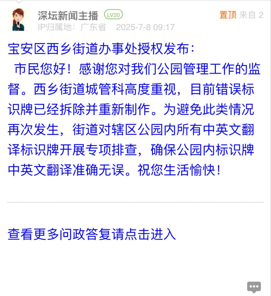 市民您好!感谢您对我们公园管理工作的监督。西乡街道城管科高度重视,目前错误标识牌已经拆除并重新制作。为避免此类情况再次发生,街道对辖区公园内所有中英文翻译标识牌开展专项排查,确保公园内标识牌中英文翻译准确无误。祝您生活愉快!