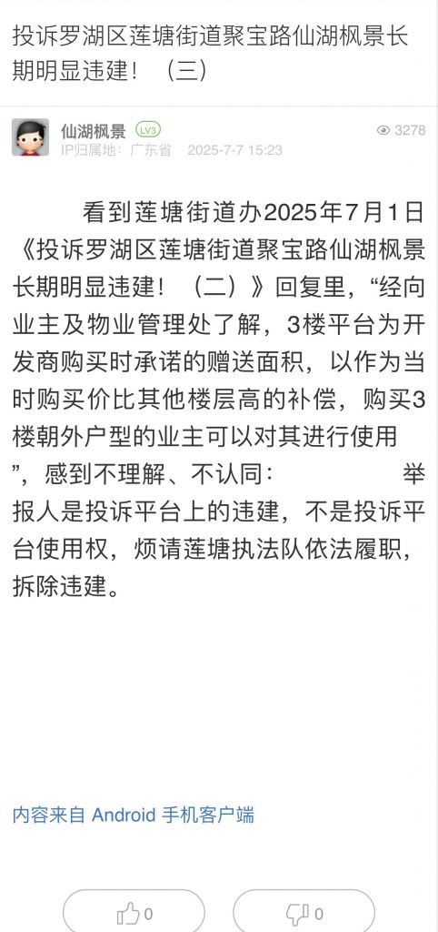 6. 帖文《投诉罗湖区莲塘街道聚宝路仙湖枫景长期明显违建!(三)》