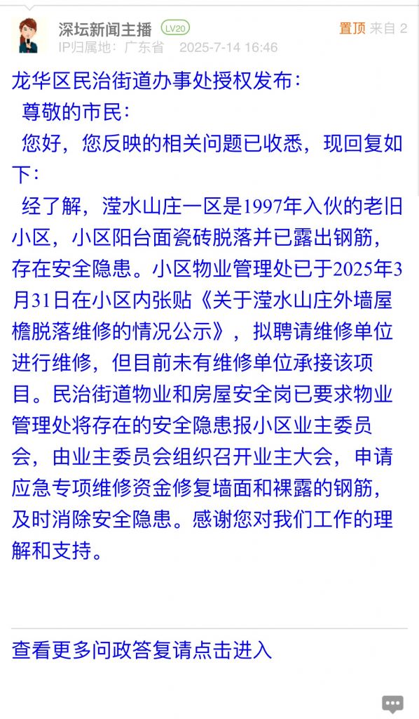 经了解,滢水山庄一区是1997年入伙的老旧小区,小区阳台面瓷砖脱落并已露出钢筋,存在安全隐患。小区物业管理处已于2025年3月31日在小区内张贴《关于滢水山庄外墙屋檐脱落维修的情况公示》,拟聘请维修单位进行维修,但目前未有维修单位承接该项目。民治街道物业和房屋安全岗已要求物业管理处将存在的安全隐患报小区业主委员会,由业主委员会组织召开业主大会,申请应急专项维修资金修复墙面和裸露的钢筋,及时消除安全隐患。感谢您对我们工作的理解和支持。