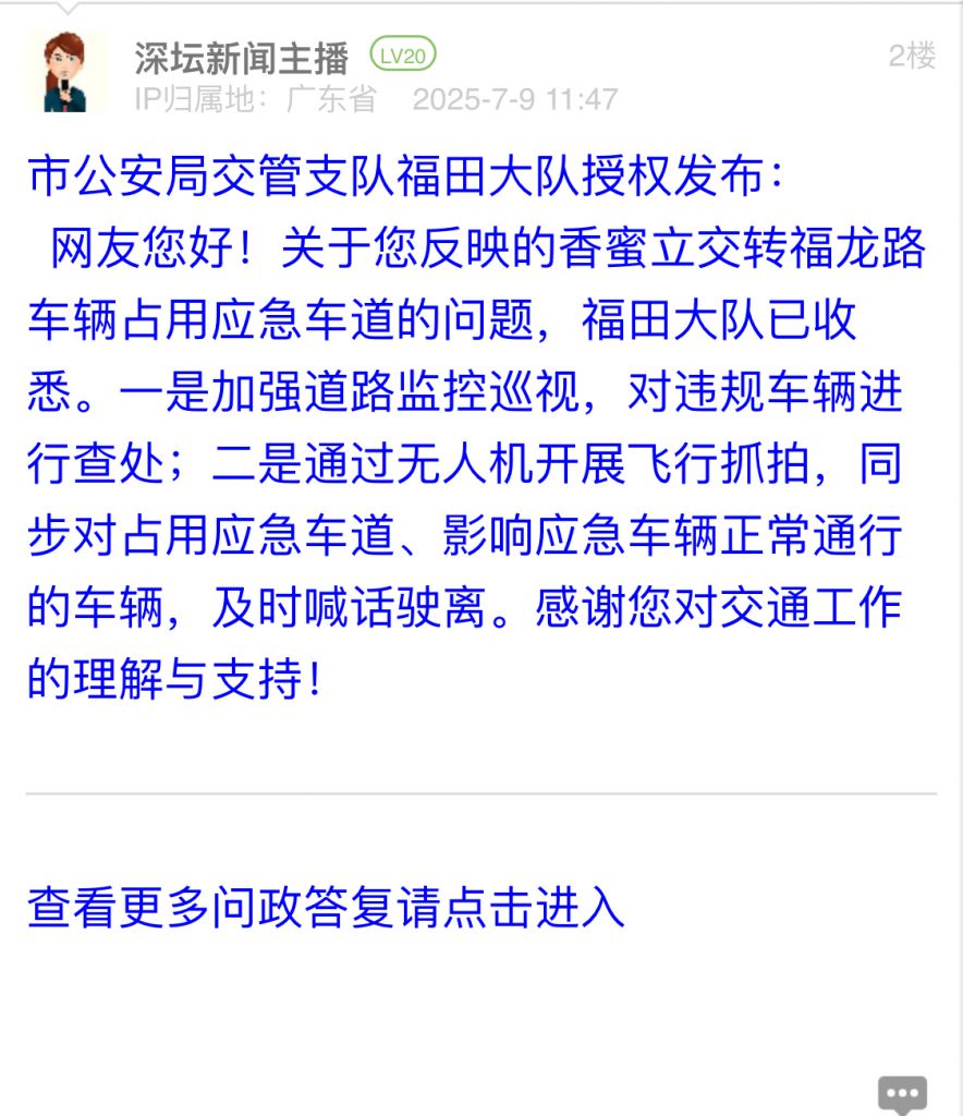 网友您好!关于您反映的香蜜立交转福龙路车辆占用应急车道的问题,福田大队已收悉。一是加强道路监控巡视,对违规车辆进行查处;二是通过无人机开展飞行抓拍,同步对占用应急车道、影响应急车辆正常通行的车辆,及时喊话驶离。感谢您对交通工作的理解与支持!