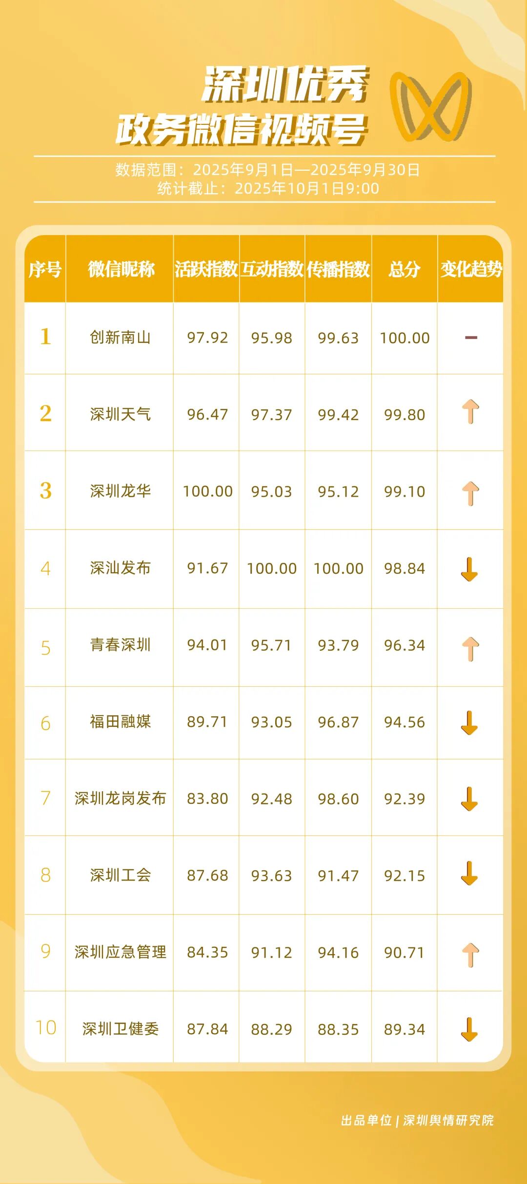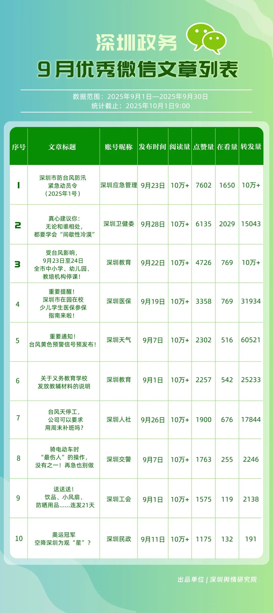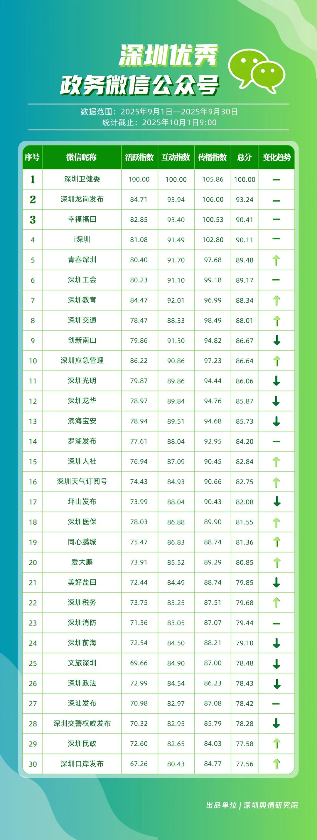 9月,“深圳卫健委”“深圳龙岗发布”“幸福福田”“i深圳”“青春深圳”“深圳工会”“深圳教育”“深圳交通”“创新南山”“深圳应急管理”等30个政务微信公众号荣登“深圳优秀政务微信公众号”榜单。9月,“深圳卫健委”以总分100.00的成绩蝉联榜单首位,其凭借突破常规视角的选题,解读专业健康知识,引发大量网民共鸣,内容质量与传播力形成双向赋能;“深圳龙岗发布”以总分93.24位居第二,聚焦区域民生服务升级等动态,信息触达率不断提升;“幸福福田”围绕商圈经济复苏、文化节庆活动等主题开展系列宣传,增强区域活力展示,位列第三;“i深圳”“青春深圳”“深圳工会”等也持续优化账号内容,通过实用信息推送强化政务服务定位。