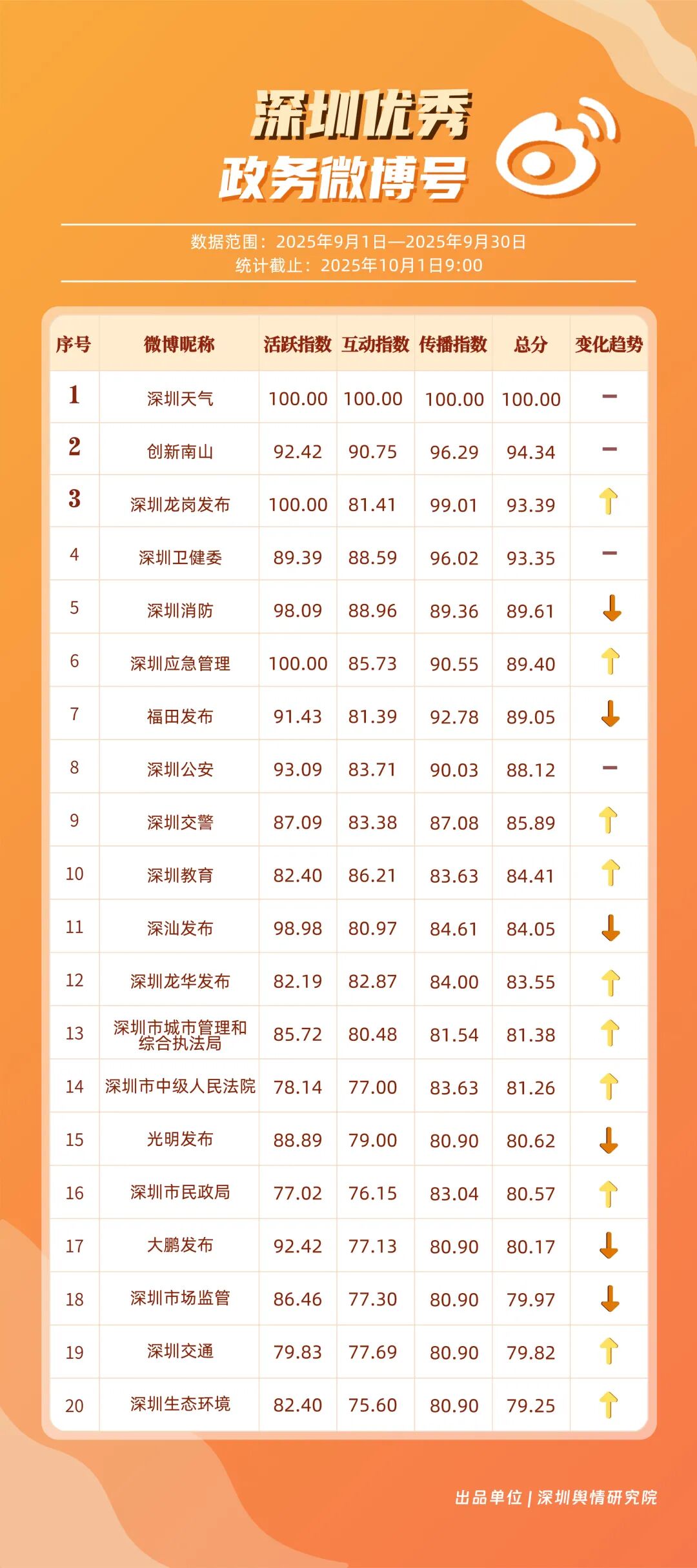9月,20个账号入选“优秀政务微博号”榜单,其中包括:“深圳天气”“创新南山”“深圳龙岗发布”“深圳卫健委”“深圳消防”“深圳应急管理”“福田发布”“深圳公安”“深圳交警”“深圳教育”等。其中,“深圳天气”蝉联榜首,尤其9月出现台风天气,账号受关注度再提升;“创新南山”账号以多维度内容策略实现传播效能提升,其内容中与歌手周深的联动也成为一大亮点,获得了较好传播效果,以94.34分排名榜单第二;“深圳龙岗发布”“深圳卫健委”两账号得分均在93分以上,在区域宣传、内容科普方向发力。上榜优秀微博账号展现出较高的内容创新能力,以年轻化语态构建传播体系,形成兼具专业性与传播力的优秀案例。