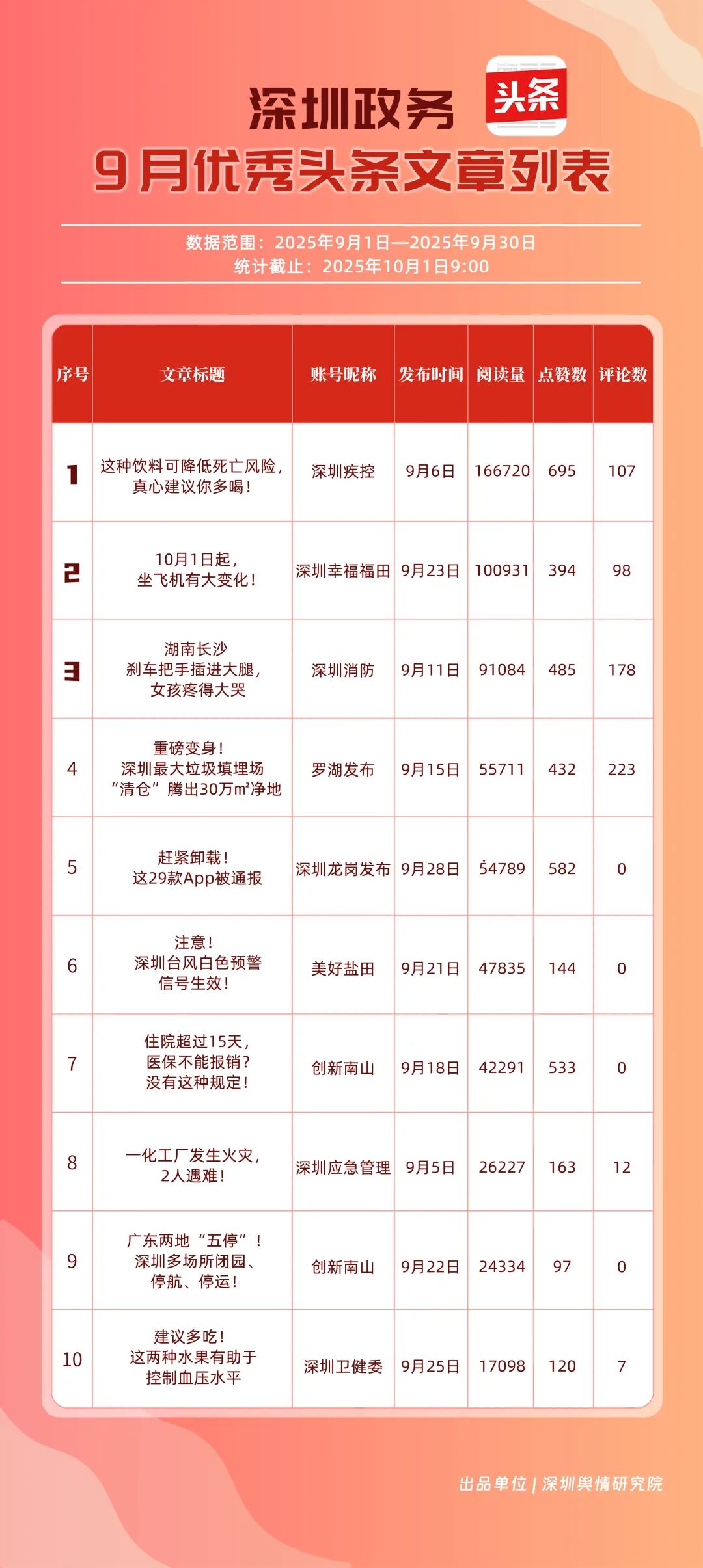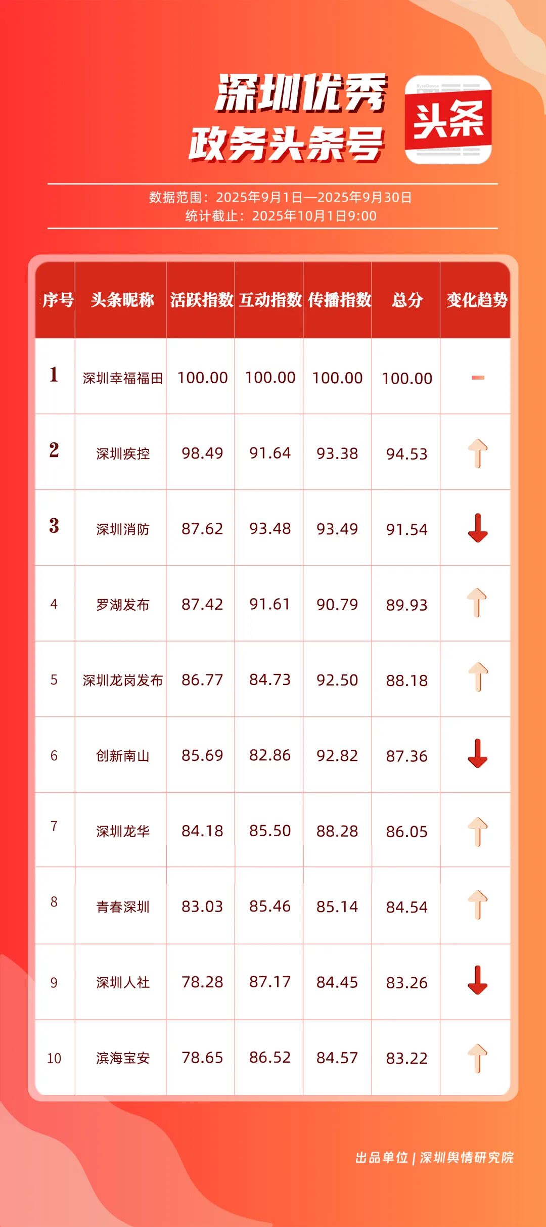 9月,“深圳幸福福田”“深圳疾控”“深圳消防”“罗湖发布”“深圳龙岗发布”“创新南山”“深圳龙华”“青春深圳”“深圳人社”“滨海宝安”共10个政务头条号入选“优秀政务头条号”榜单。“深圳幸福福田”稳居榜单首位,在传播、互动等方面均表现卓越;“深圳疾控”关注民生健康,有关“喝茶的好处”“非正规医美针风险”两篇文章阅读均超10万次,为市民提供健康信息;“深圳消防”聚焦消防安全领域,提醒市民注意安全。相关上榜账号表现优异,注重内容实用化、互动场景化,彰显了政务新媒体的服务效能。