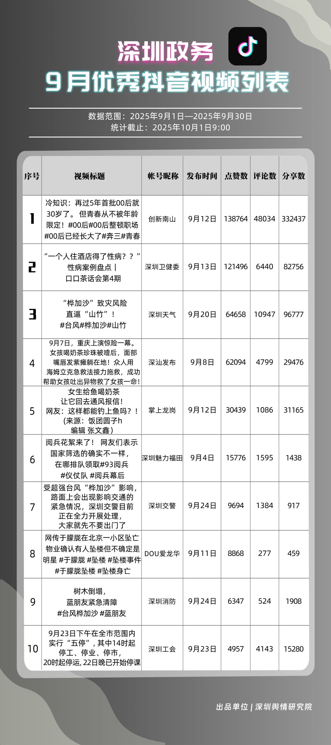 9月,获得“优秀政务抖音号”称号的是“创新南山”“深圳天气”“深圳卫健委”“深圳魅力福田”“深汕发布”“掌上龙岗”“DOU爱龙华”“深圳工会”“青春深圳”“深圳交警”。“创新南山”以一条有关“青春不被年龄限定”的视频获得超34万次转发,超14万次点赞,助力其在抖音榜单居于榜首;“深圳天气”多条台风相关视频吸引大量网民关注、互动,在抖音平台得分超98分;“深圳卫健委”“深圳魅力福田”“深汕发布”等账号紧随其后,得分均在92分以上。上榜的优秀政务抖音号以“有温度”的叙事表达,将宣传、服务内容转化为网民喜闻乐见的视频,收获高点赞、高转发的流量实绩,更在评论区形成了良性互动生态,深度运营收获了较好成果。