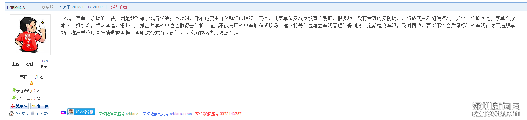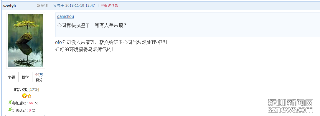 “福田河的水质很好,但大量的故障单车停放在路边实在是煞风景。”网友“szwtyh”认为,不应该让这些单车碍了深圳的城市景观,扫了市民欣赏福田河水的兴致。