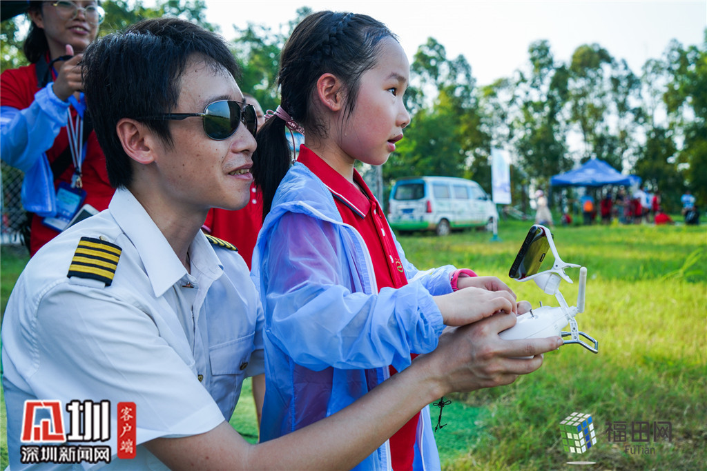 无人机飞行课程,小朋友在飞手的指导下学习操作无人机。