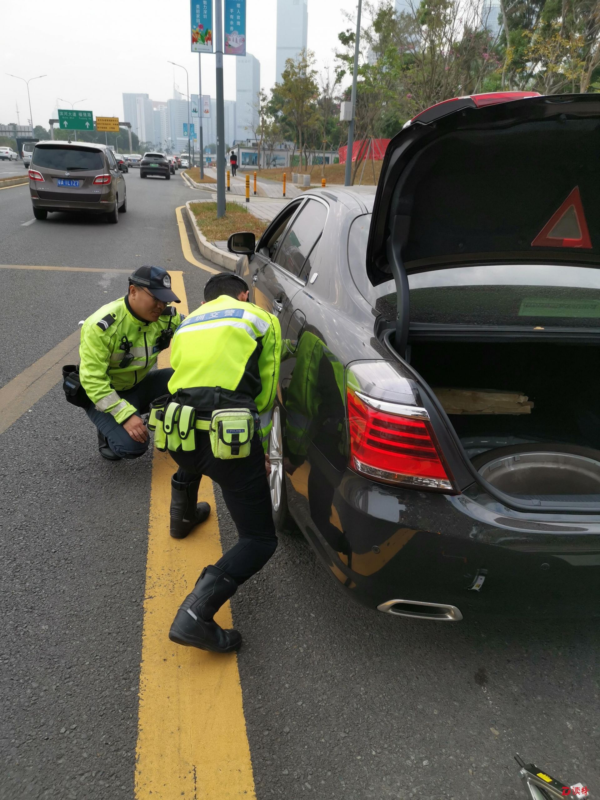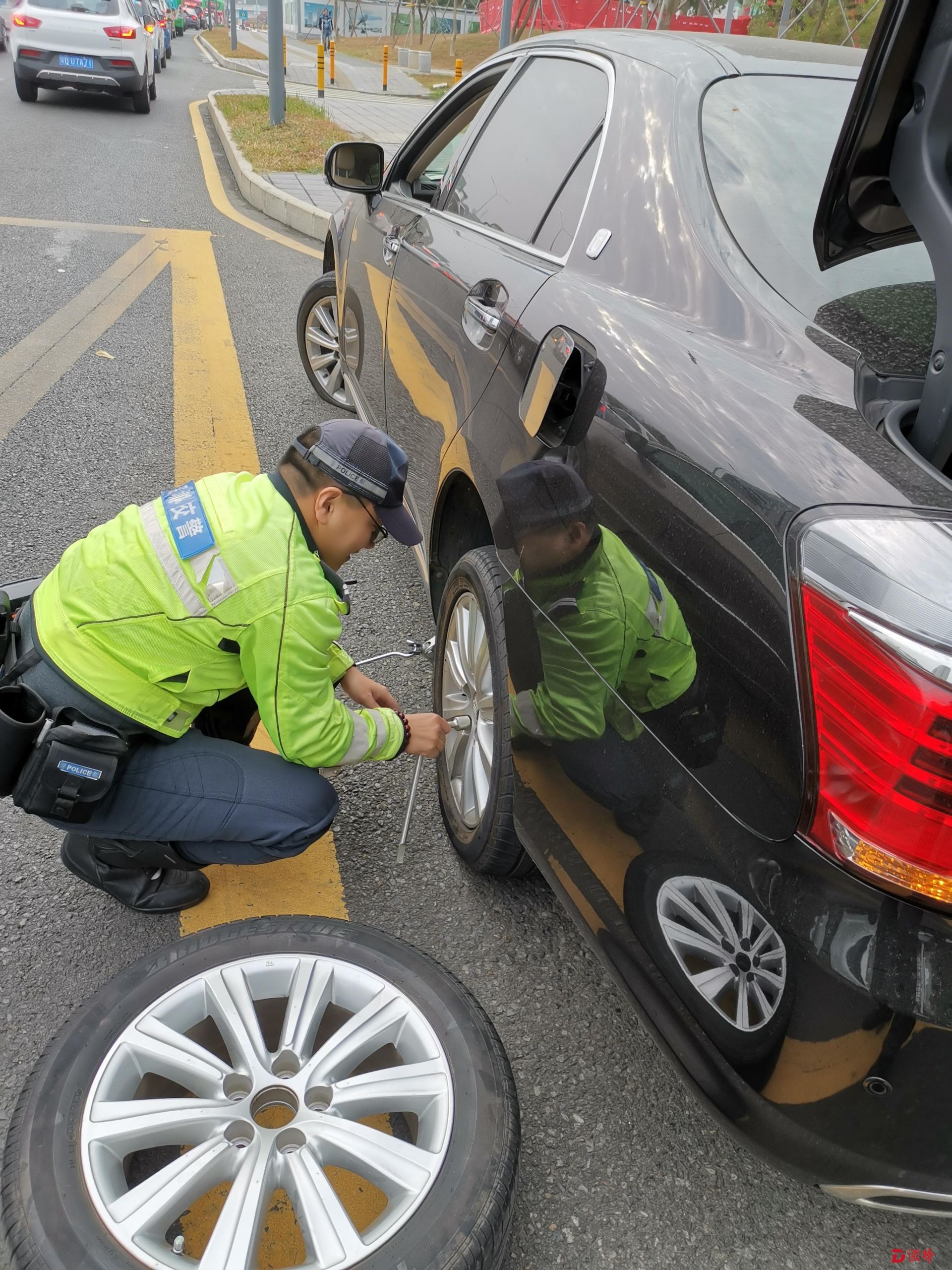 正当记者心急如焚且束手无策之时,在路上巡查的福田交通大队香蜜湖中队铁骑郑彬锐警官途经此地,见状他立即停住铁骑,上前询问情况。当他看到车辆左侧两轮均瘪下时,立即问记者是否有备胎,同时让记者赶紧联系车行再送一个备胎过来。