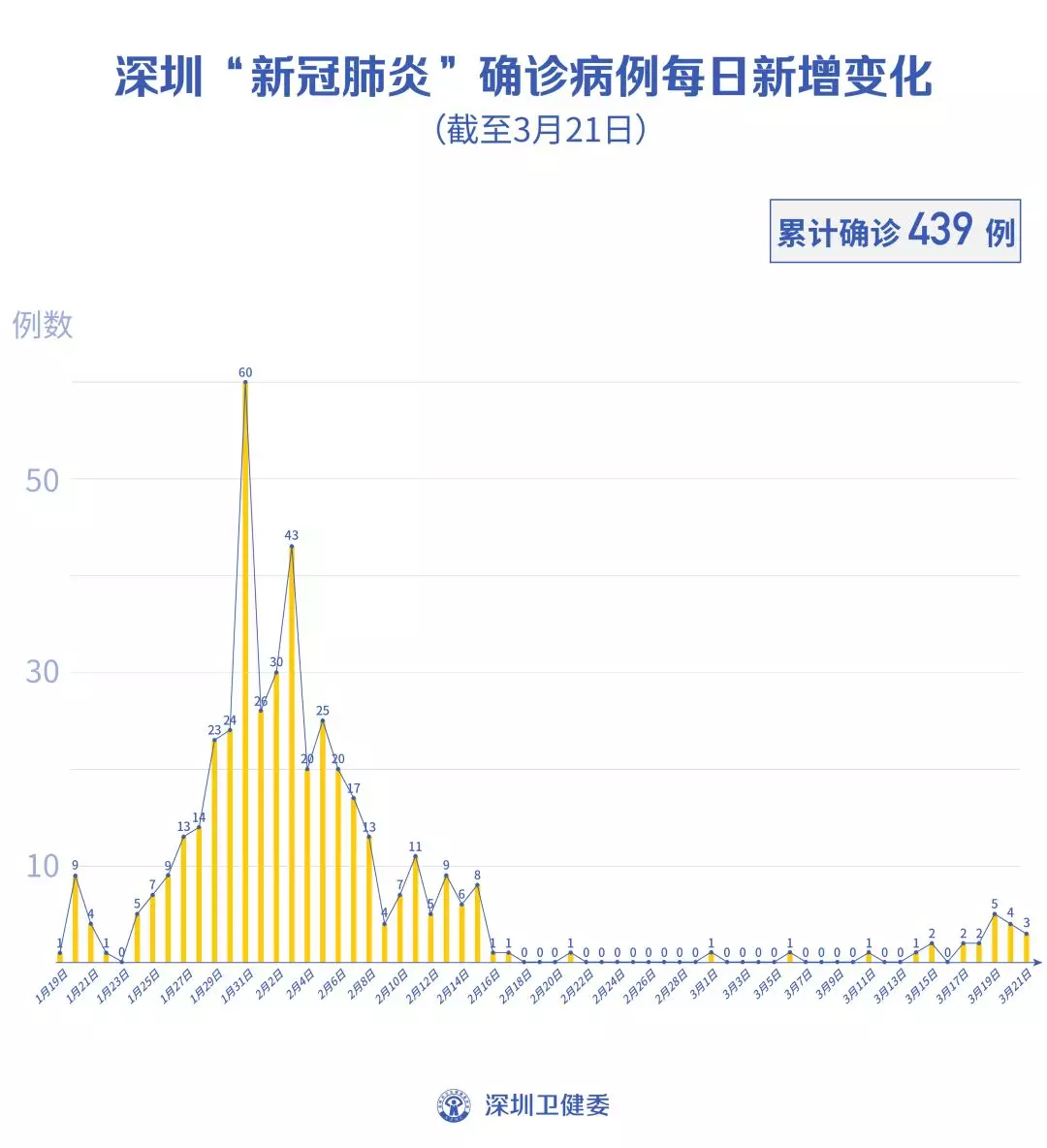 截至3月21日24时,深圳累计报告“新冠肺炎”病例439例。3月21日当天新增3例,出院1例。