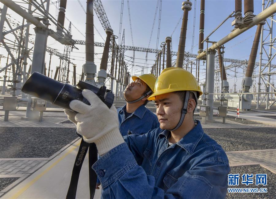 在吐鲁番市750千伏变电站,两位工作人员利用专用设备对电力设施进行检查(9月18日摄)。新华社记者赵戈 摄