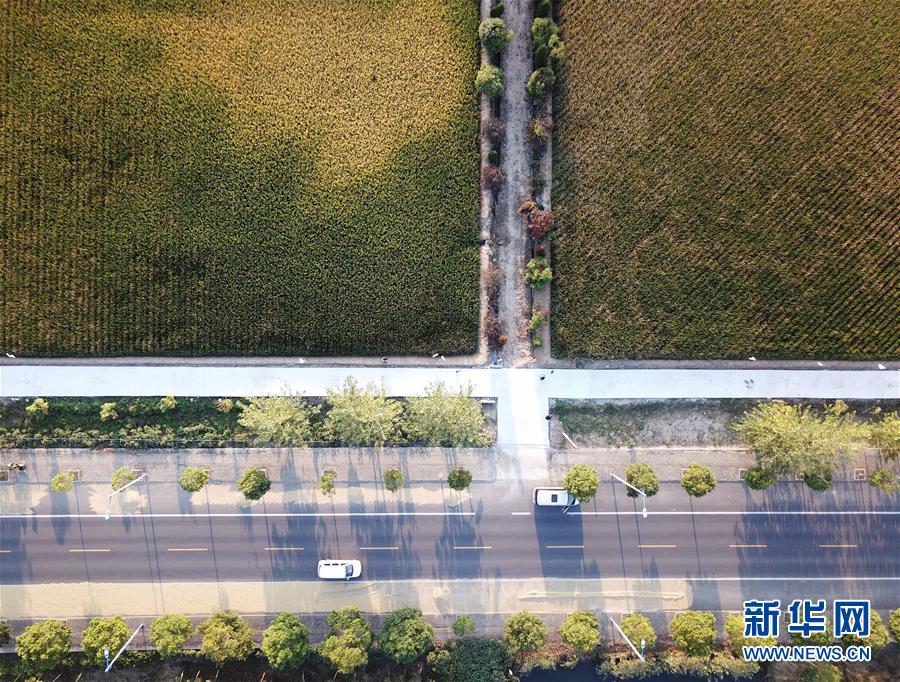 这是小岗村的稻田及公路(9月26日无人机拍摄)。