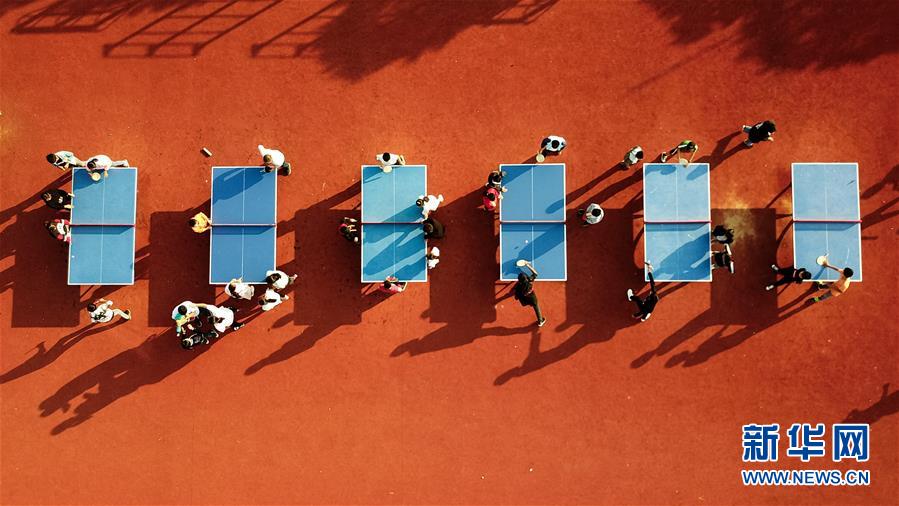 学生在安徽凤阳小岗村小岗学校内打乒乓球(9月26日无人机拍摄)。 新华社记者 张端摄
