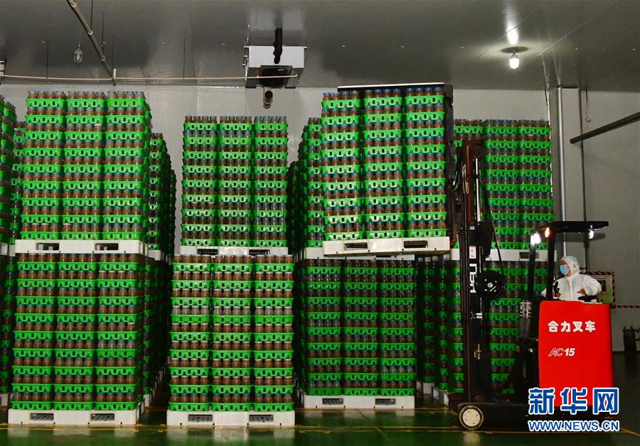 在位于清丰县的河南龙丰实业股份有限公司,一名工人操作叉车在培养车间搬运接种后的食用菌栽培瓶(9月28日摄)。新华社记者冯大鹏摄