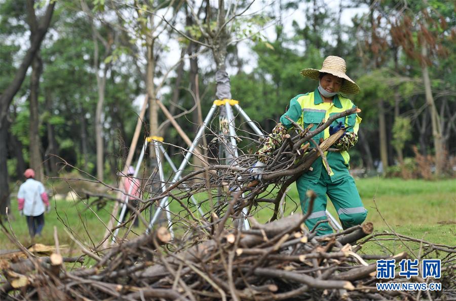 10月1日,工作人员在深圳街头的绿化带清理强台风“山竹”损毁的树木。当日是国庆节,许多劳动者坚守在工作一线,在岗位上度过节日。新华社记者毛思倩摄