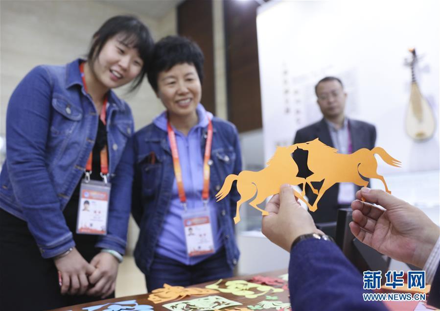 11月4日,在首届中国国际进口博览会新闻中心,媒体记者观看中国传统剪纸技艺展示。 新华社记者兰红光摄