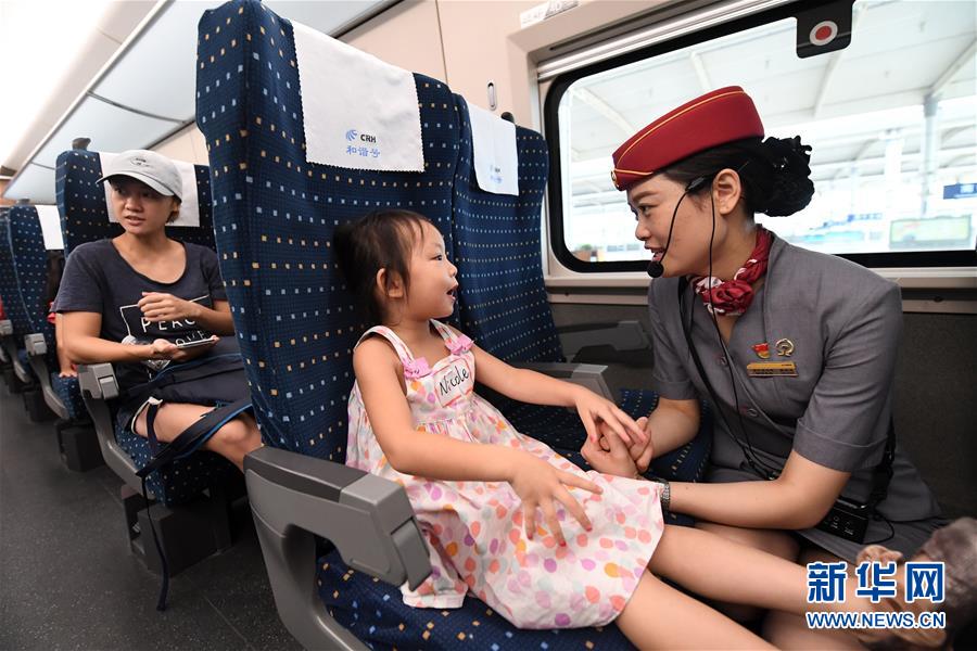 在南宁东站,一名列车工作人员在和一名小朋友交流(2017年8月5日摄)。 广西壮族自治区成立60年来,铁路建设发生翻天覆地的变化。来自中国铁路南宁局集团有限公司的数据显示,1958年广西铁路总里程为1346.3公里,如今广西铁路总里程达5191公里。广西与周边相邻省份间实现动车“公交化”开行。此外,北部湾港—重庆班列、东盟海产品冷链班列、“百色一号”果蔬专列等的开通和运营,强化了铁路供给的针对性和有效性。铁路成为助推广西经济社会快速发展的“大动脉”。 新华社记者陆波岸摄