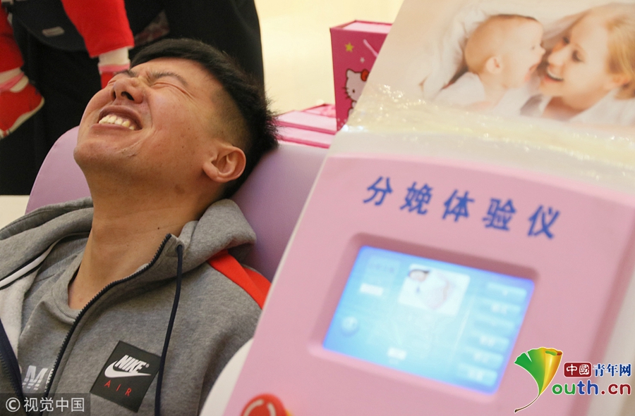 2018年3月8日,一名男士在山东烟台大悦城通过“分娩体验仪”感受“分娩”时的阵痛。