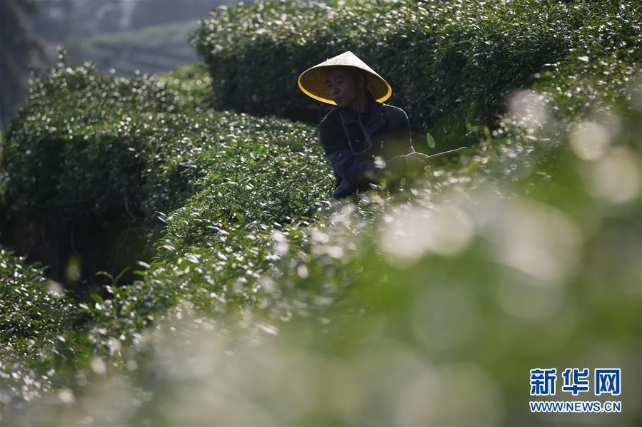 11月22日,在广西柳州三江侗族自治县八江镇布央村,村民吴正光在修剪茶树。新华社记者任正来摄
